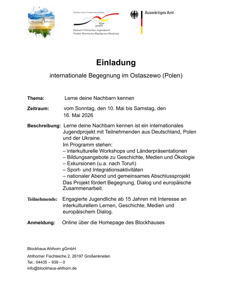 Poznaj swoich sąsiadówOd 10.05 do 16.05.2026 w Blockhaus Ahlhorn Rejestracja Rejestracja jako uczestnik