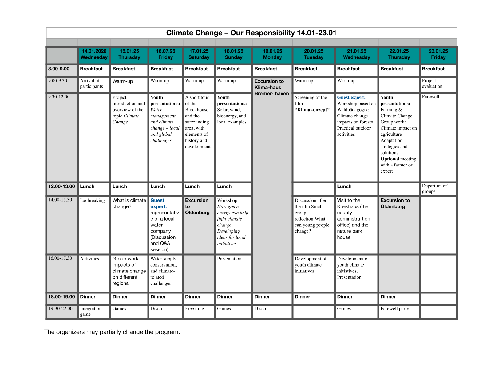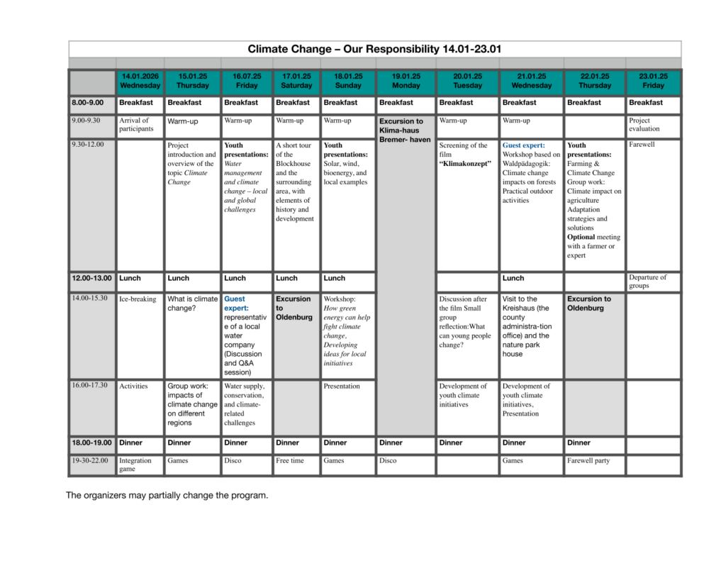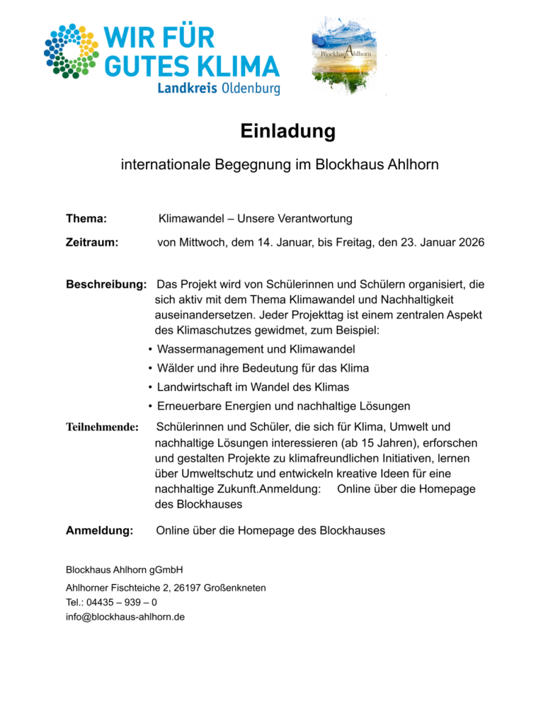 Zmiany klimatu – nasza odpowiedzialność30. grudnia 2025 Od 14.01 do 23.01.2026 w Blockhaus Ahlhorn Harmonogram Rejestracja Zarejestruj się jako uczestnik